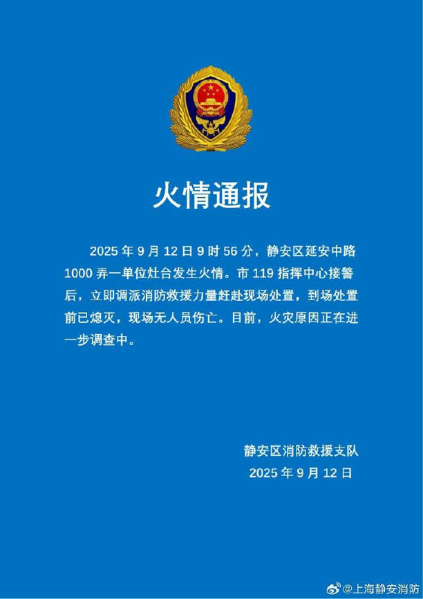 2025年9月12日9时56分,静安区延安中路1000弄一单位灶台发生火情。市119 指挥中心接警后,立即调派消防救援力量赶赴现场处置,到场处置前已熄灭,现场无人员伤亡。目前,火灾原因正在进一步调查中。
